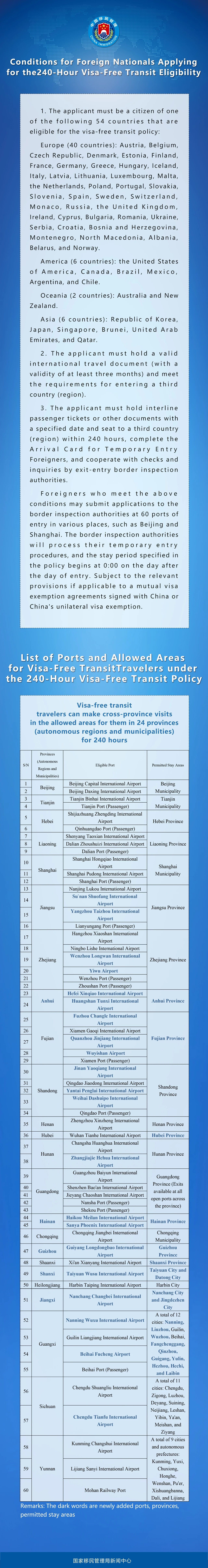 The 21 newly added ports for the visa-free transit policy are Taiyuan Wusu International Airport in Shanxi province, Su'nan Shuofang International Airport and Yangzhou Taizhou International Airport in Jiangsu province, Wenzhou Longwan International Airport and Yiwu Airport in Zhejiang province, Hefei Xinqiao International Airport and Huangshan Tunxi International Airport in Anhui province, Fuzhou Changle International Airport, Quanzhou Jinjiang International Airport, and Wuyishan Airport in Fujian province, Nanchang Changbei International Airport in Jiangxi province, Jinan Yaoqiang International Airport, Yantai Penglai International Airport, and Weihai Dashuipo International Airport in Shandong province, Zhangjiajie Hehua International Airport in Hunan province, Nanning Wuxu International Airport and Beihai Fucheng Airport in Guangxi Zhuang autonomous region, Haikou Meilan International Airport and Sanya Phoenix International Airport in Hainan province, Chengdu Tianfu International Airport in Sichuan province, and Guiyang Longdongbao International Airport in Guizhou province. The number of opened ports has increased from the original 39 to 60.